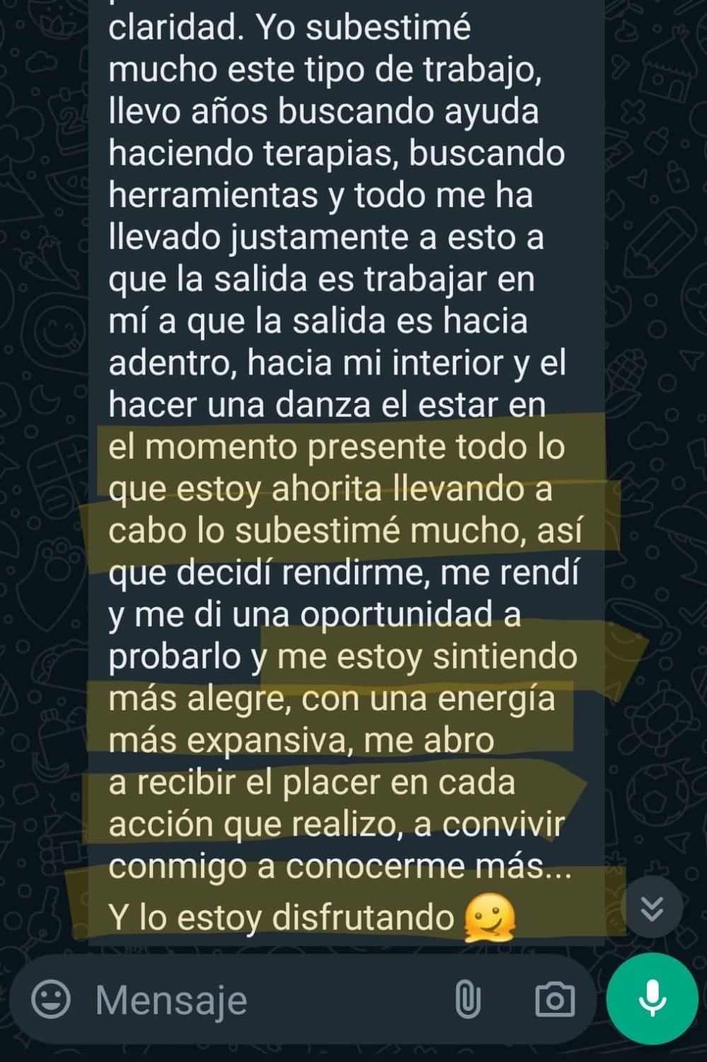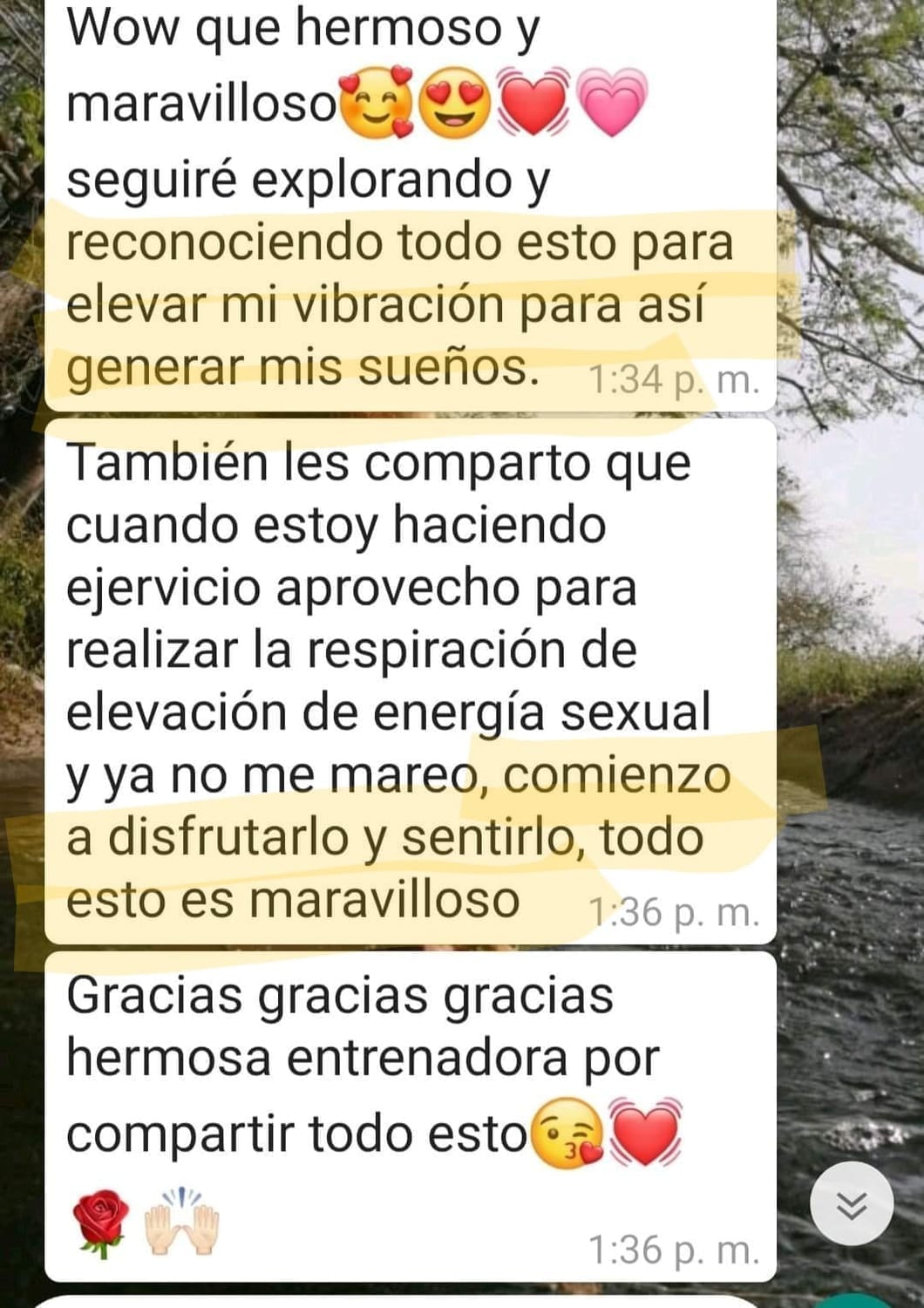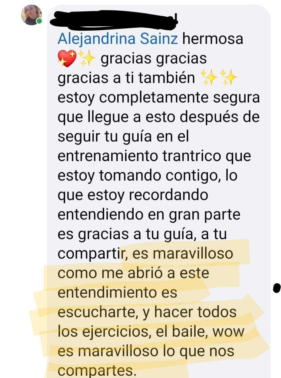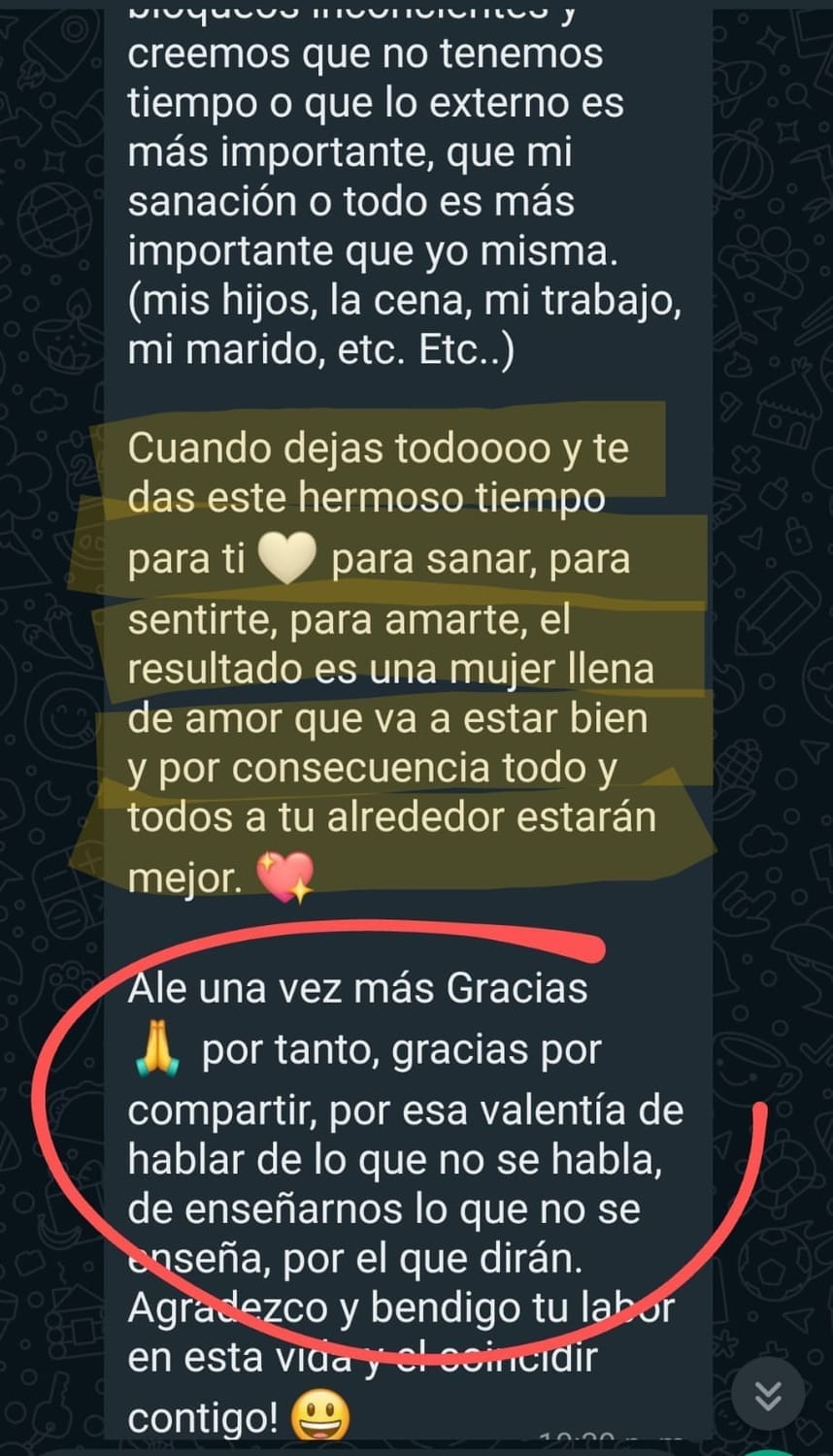 "...es maravilloso como me abrió a este entendimiento, es escucharte y hacer todos los ejercicios, el baile, wow, es maravilloso lo que nos compartes."